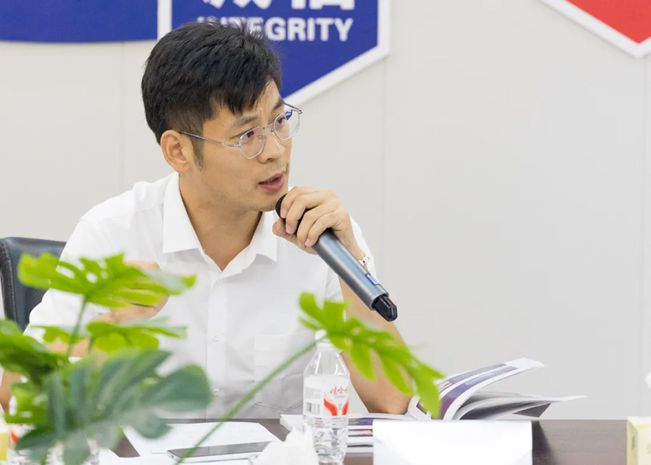 林榆彬代表埃飞灵集团对评审组表示欢迎,并对协会给予的支持和信任表示感谢,他详细介绍了公司两年来产品创新、新材料开发、设备投入等方面工作及公司未来发展战略布局规划。